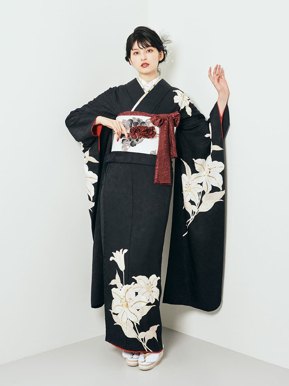 シンプルな黒の振袖には、あえて多くの色を使わずすっきりとさせると野暮ったくなくアーバンな着こなしができるでしょう。袖口と裾の赤色に合わせた帯締めと帯揚げがポイントですね。