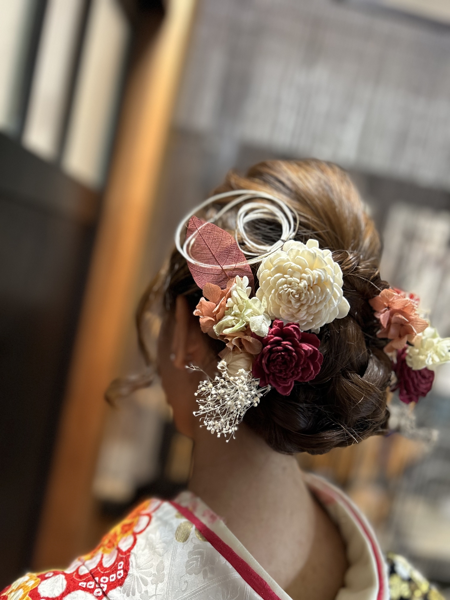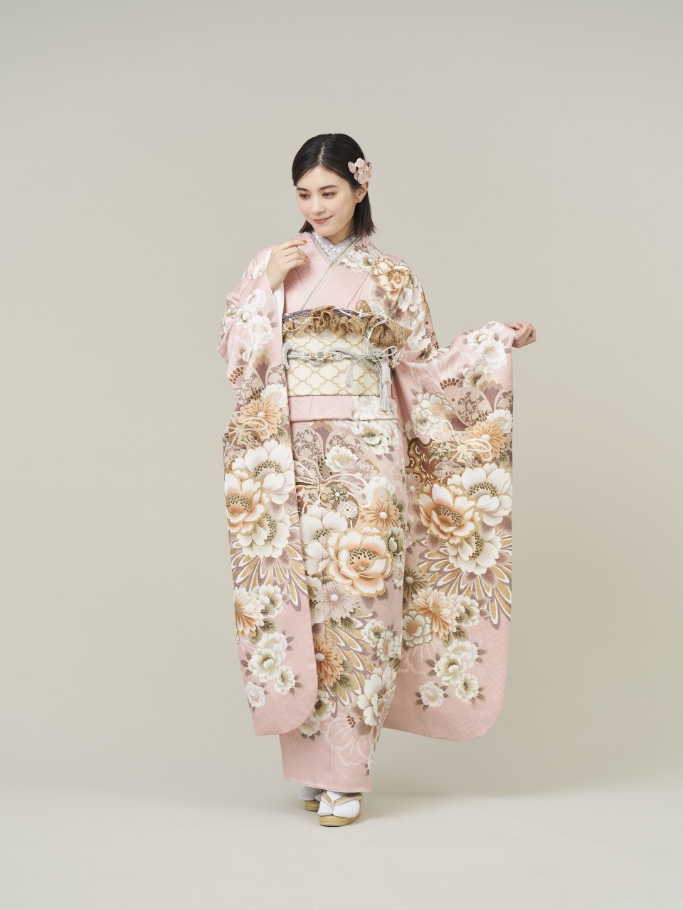 振袖姿の完成度を高めるためには、ヘアアレンジも重要なポイントです。淡い色の振袖は全体的にやさしく控えめな印象を与えるので、髪型とのバランスを意識することで、装い全体にまとまりが生まれます。   髪色が明るいブラウンの方や柔らかい質感の方は、ゆるやかなウェーブやまとめ髪スタイルが好相性です。反対に黒髪やシャープな輪郭の場合は、タイトなシニヨンやストレートアレンジで凛とした印象に仕上げると、振袖とのバランスがとれます。   また、髪飾りに工夫を凝らすと印象を変えられます。たとえば、淡い色の花や金箔、パールなどを用いることで、上品さや華やかさが加わるのでおすすめです。